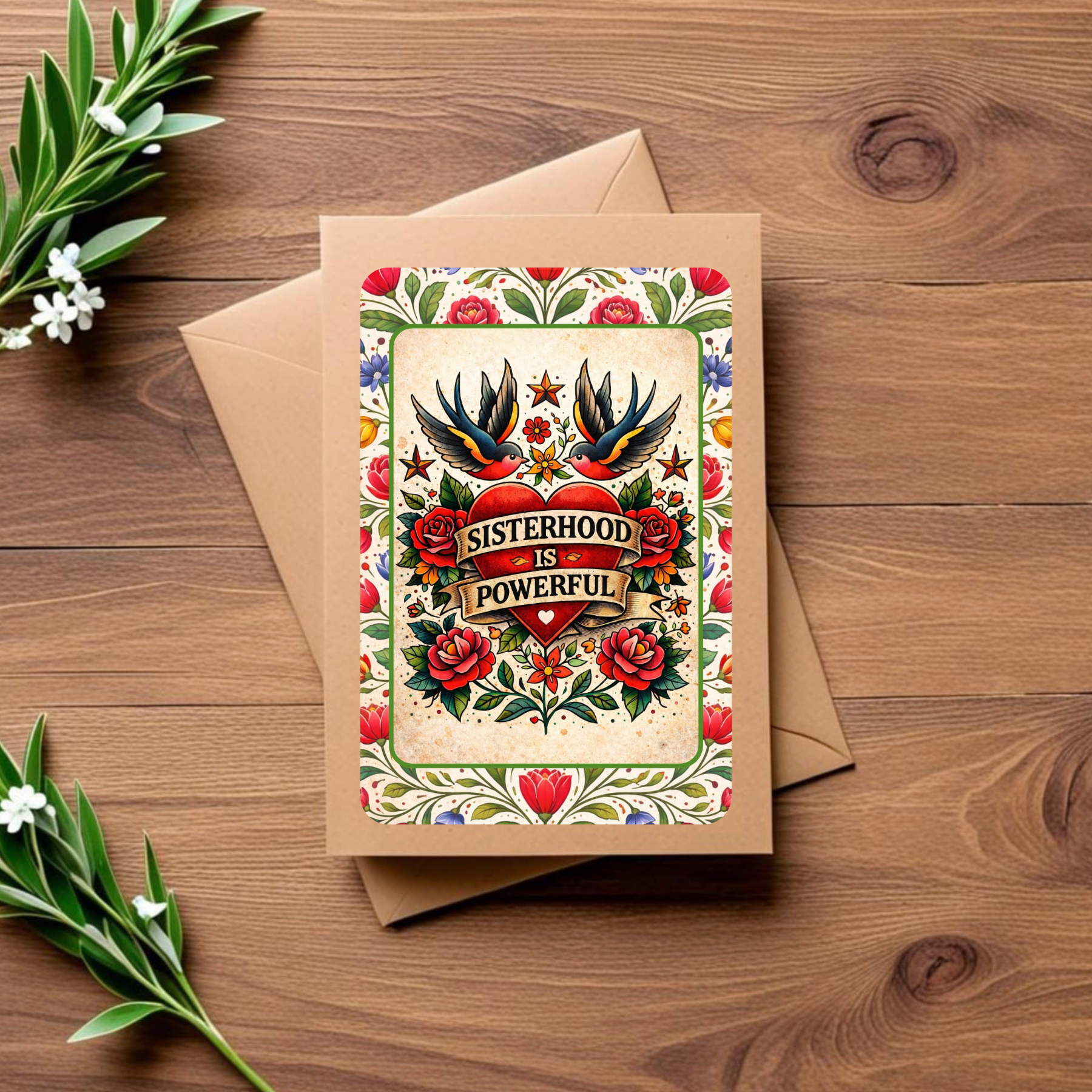 This blank kraft note card features the phrase “Sisterhood Is Powerful,” celebrating solidarity, mutual support, and the strength that comes from showing up for one another. It’s a reminder that change has always been collective.
